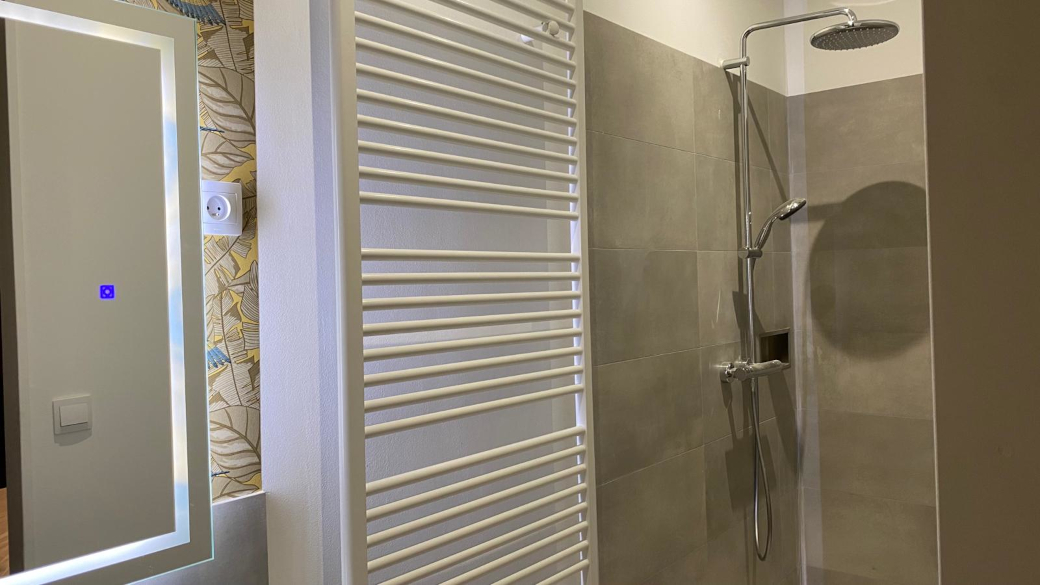 La salle d'eau offre de beaux espaces avec une douche en 80x140, un WC privatif et d'une vasque avec miroir a led.