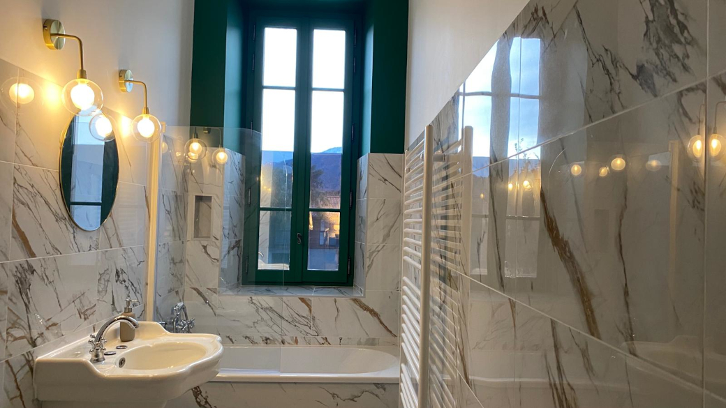 La salle de bain toute en carrelage marbré saura vous charmer avec sa vue sur le Cagire, le mont emblématique du village.